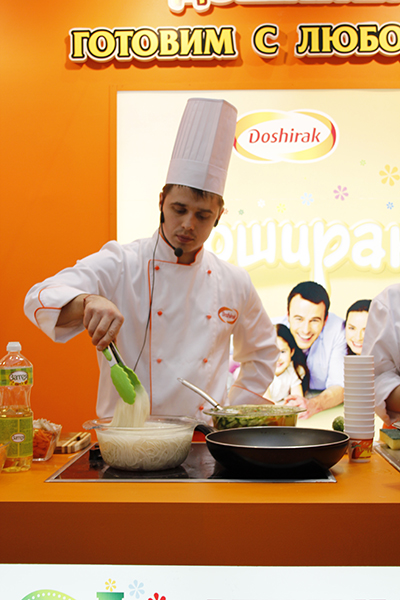 На стенде Доширак проводились мастер классы по приготовлению новых продуктов. Особенное внимание было уделено пшеничной лапше Кукси, которая используется для приготовления одноименного блюда.