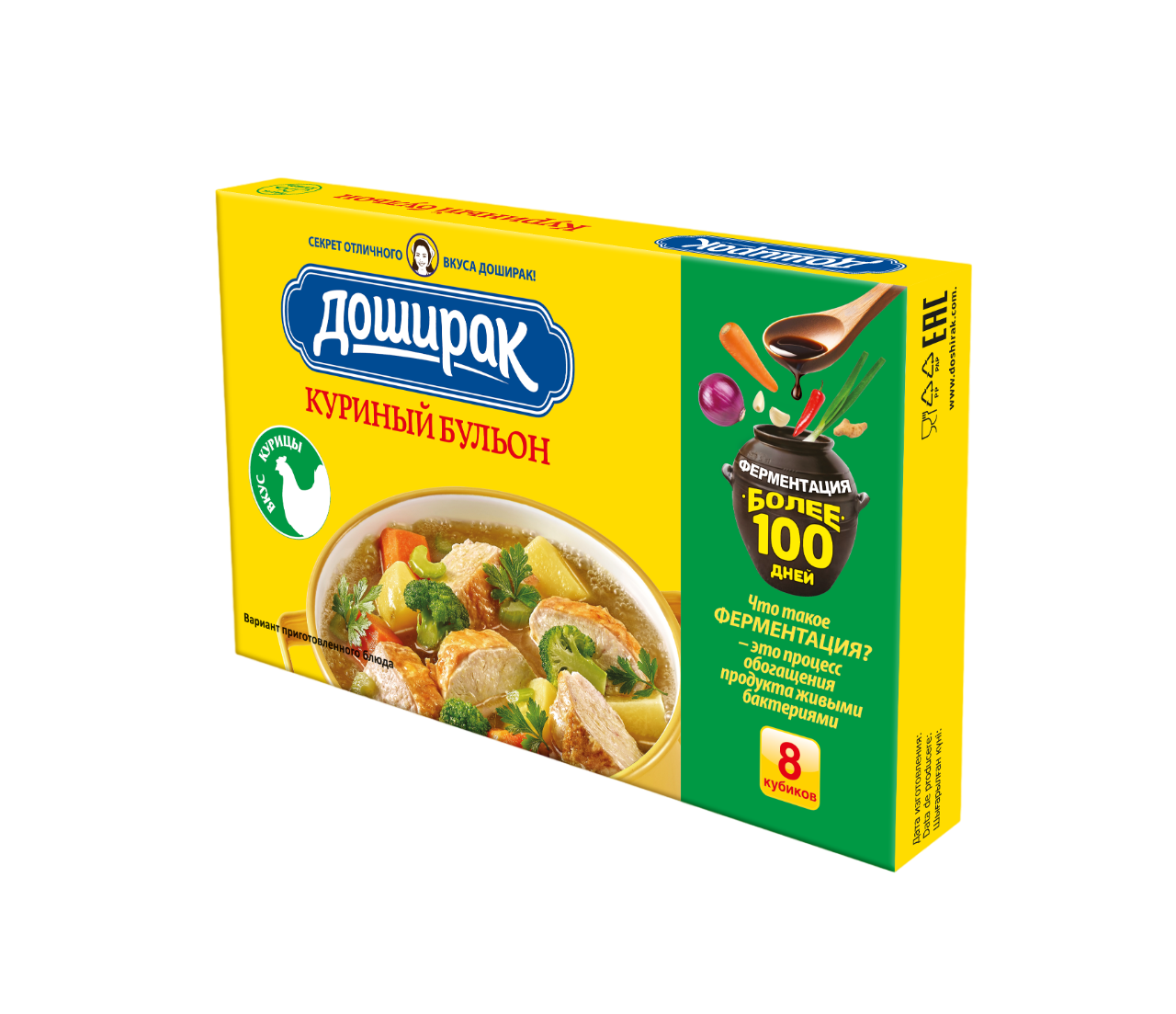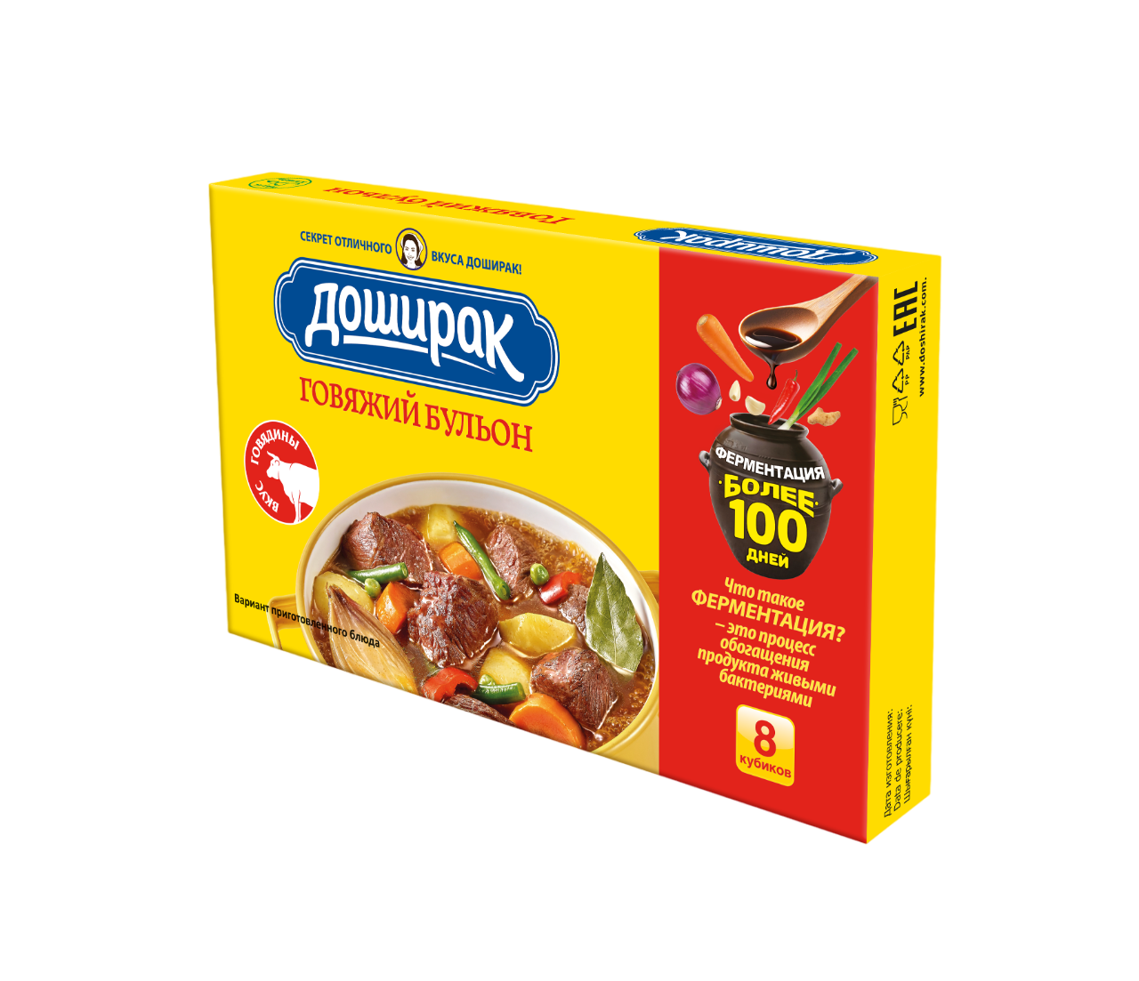 Бульонные кубики Доширак - универсальное решение для насыщенного вкуса и аромата супов и вторых блюд. В основу бульона мы добавили уникальные ингредиенты, которые прошли длительную ферментацию в течение 100 дней. Благодаря естественной ферментации вкус и аромат нашей лапши становится богатым и глубоким. Секрет нашего уникального вкуса Доширак -  в ферментации!