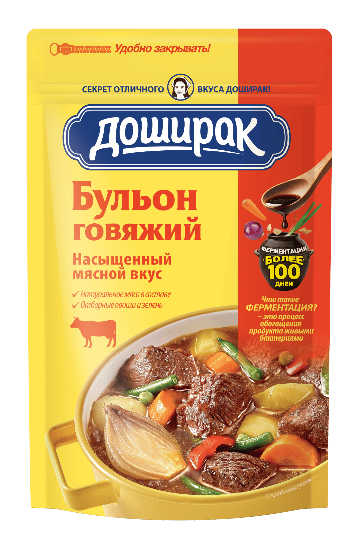 Бульоны Доширак - это универсальная база для приготовления любимых блюд от соуса и супа, до жаркого и овощного рагу. В состав бульона входит соевый соус, изготовленный методом ферментации. Во время ферментации происходит естественное брожение. Микробы, отвечающие за процесс ферментации, превращают сложную пищу в простую, следовательно, она легче усваивается организмом, становится питательнее и вкуснее. «Правильный» соевый соус выдерживается как можно дольше. В нашем случаем процесс ферментации занимает более 100 дней, что делает соус более ярким и насыщенным. Удобный многоразовый zip-lock замок, позволят надолго сохранять вкус и аромат бульона.