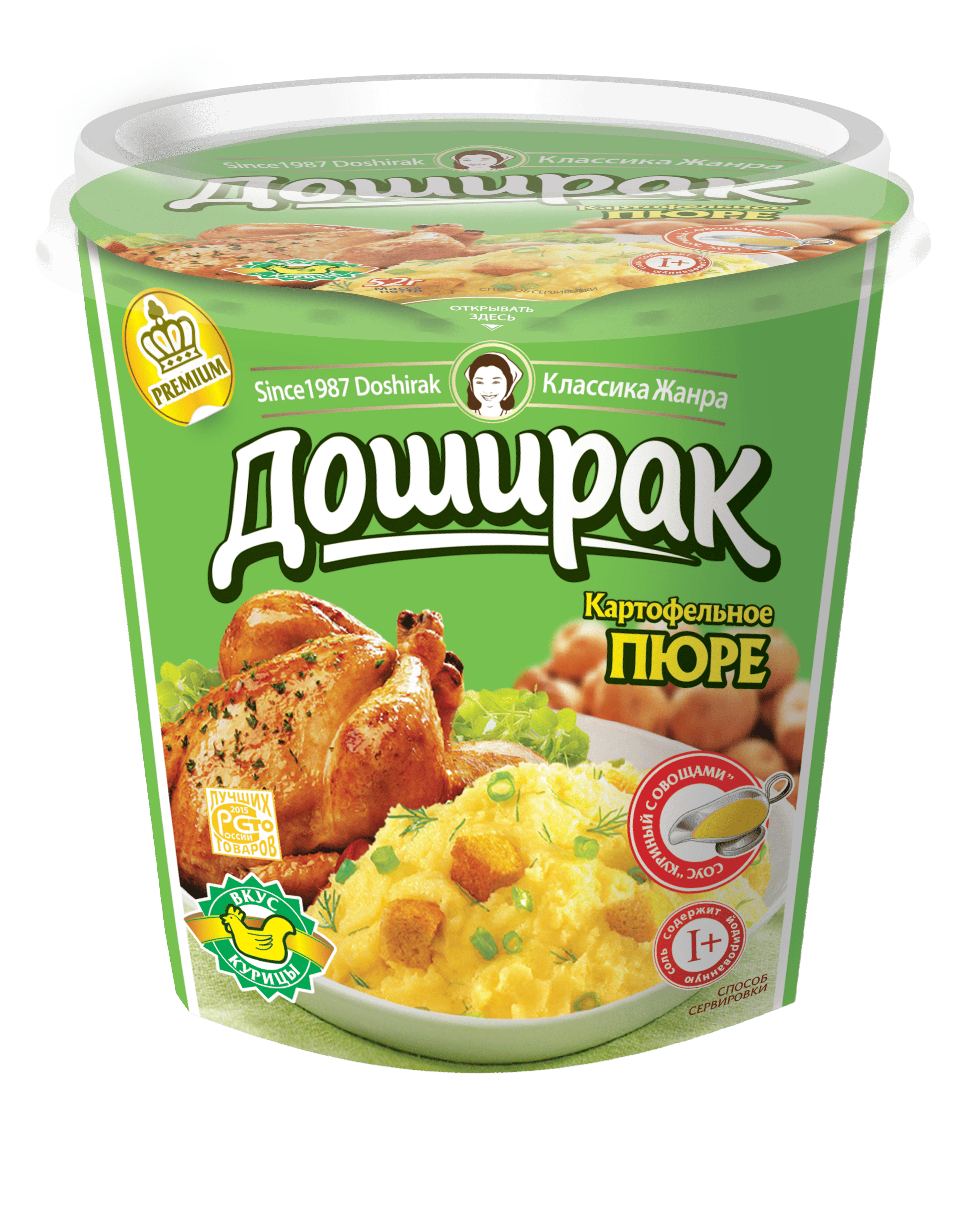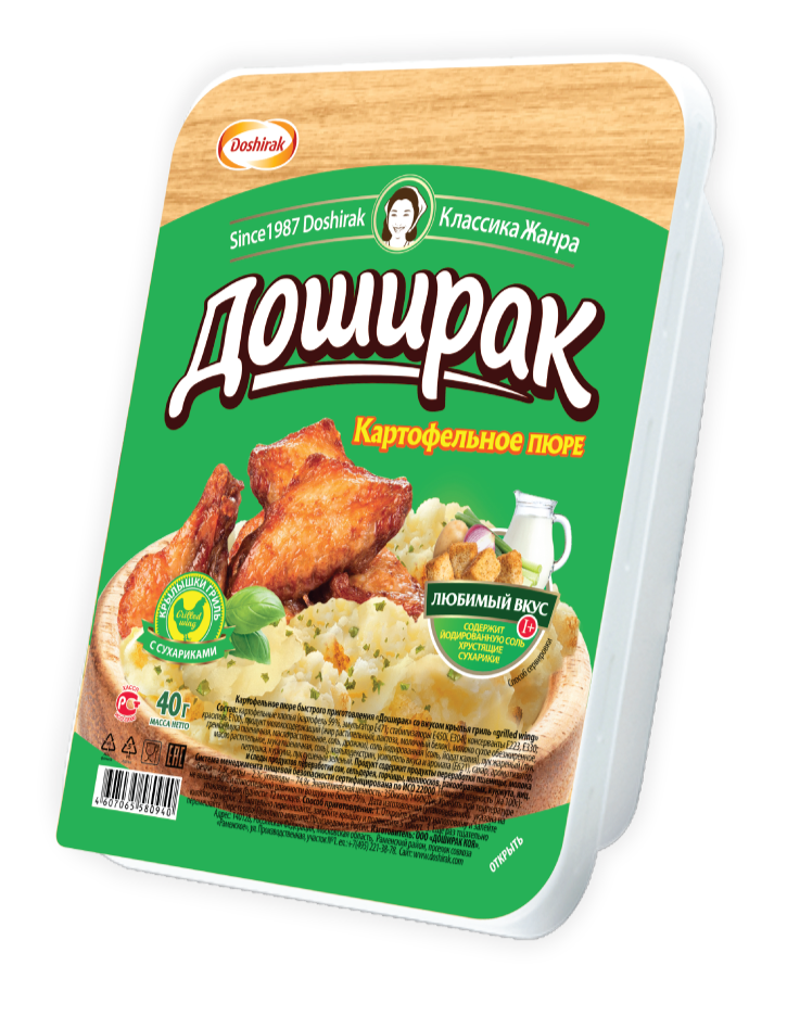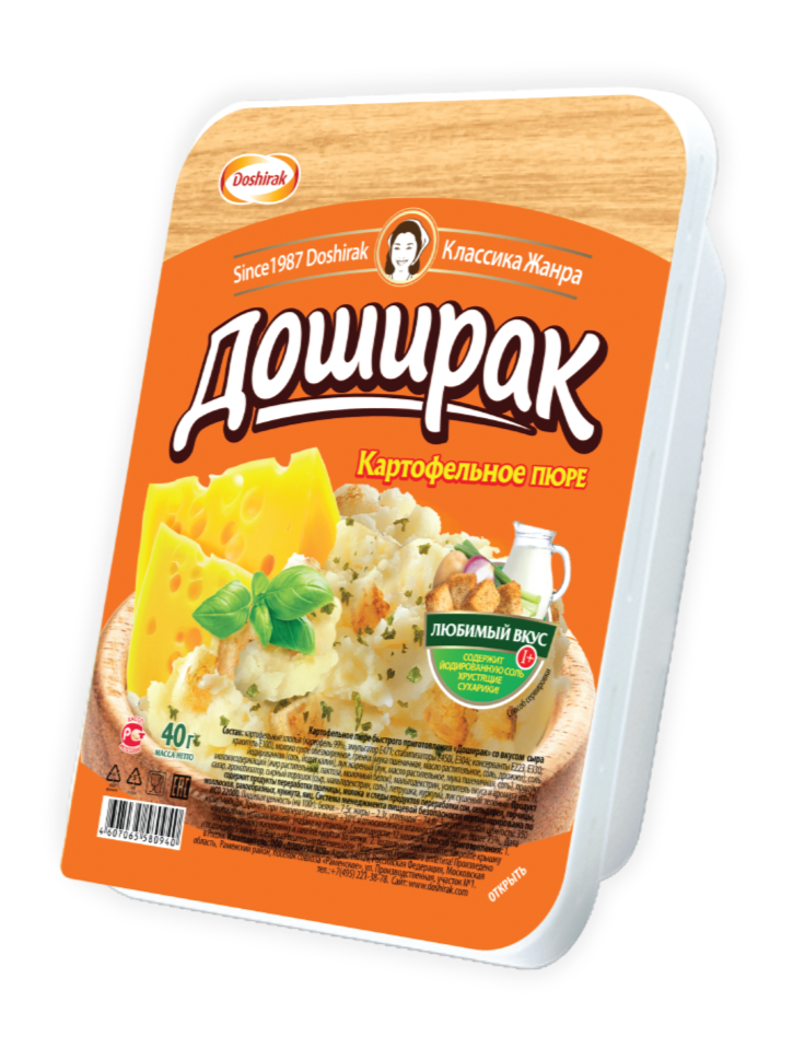 Картофельное пюре Doshirak продается в нестандартной для пюре упаковке – фирменном прямоугольном лотке. Простой и удобный способ быстро утолить голод в любом месте и в любое время.