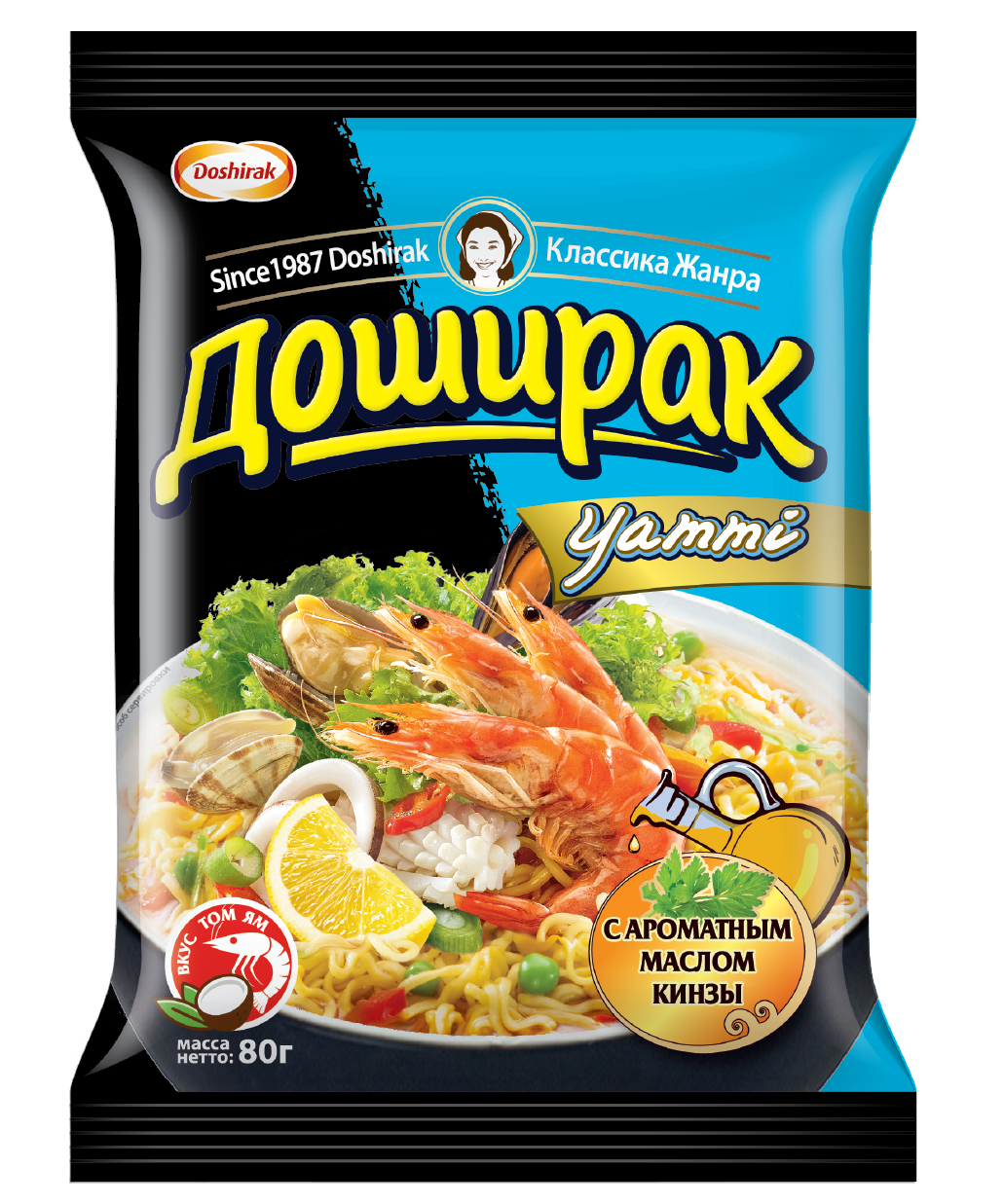 Лапша быстрого приготовления Доширак Yammi - это любимая лапша в удобной упаковке. В каждом пакете вы найдете мясной соус, который сделает бульон еще более наваристым и пикантным. Изюминкой линейки Yammi считается вкус Том Ям. Том Ям это традиционное блюдо Таиланда. Предстваляет собой кисло-острый наваристый суп с морепродуктами или курицей. Обязательным ингредиентом является кинза. Масло с кинзой входит в состав нашего продукта.