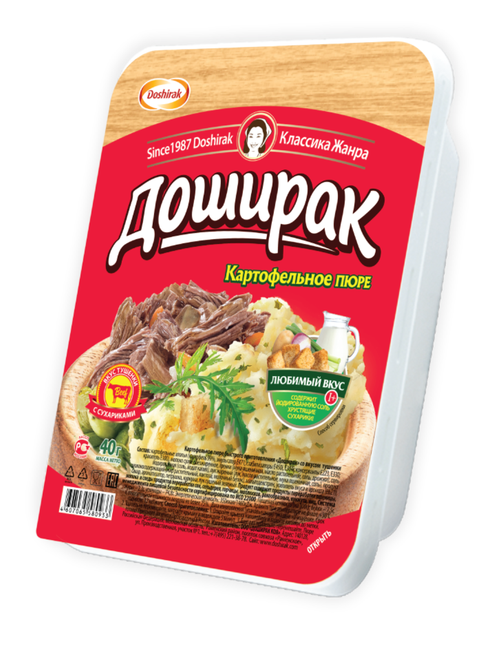 Картофельное пюре Doshirak продается в нестандартной для пюре упаковке – фирменном прямоугольном лотке. Простой и удобный способ быстро утолить голод в любом месте и в любое время.