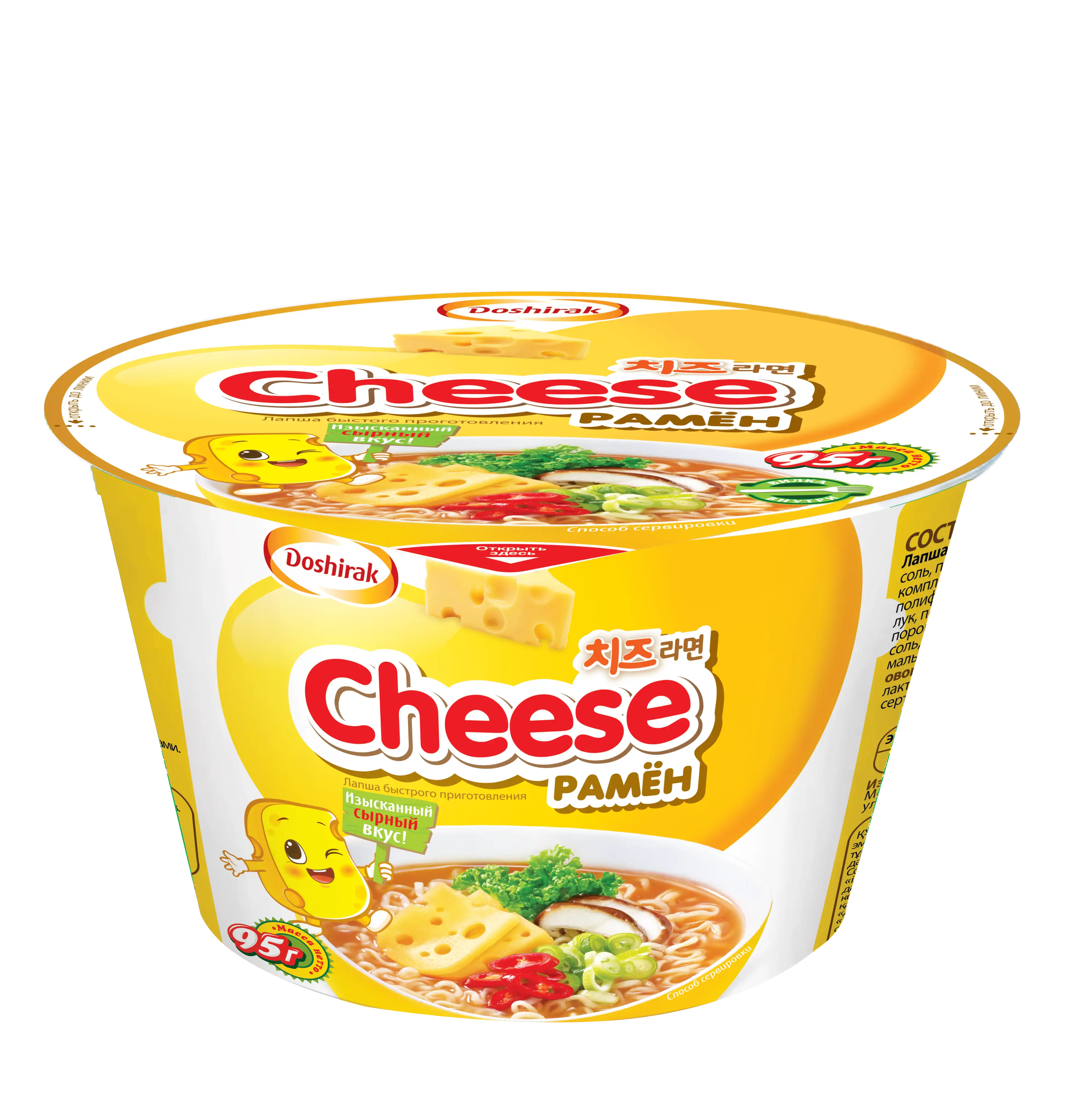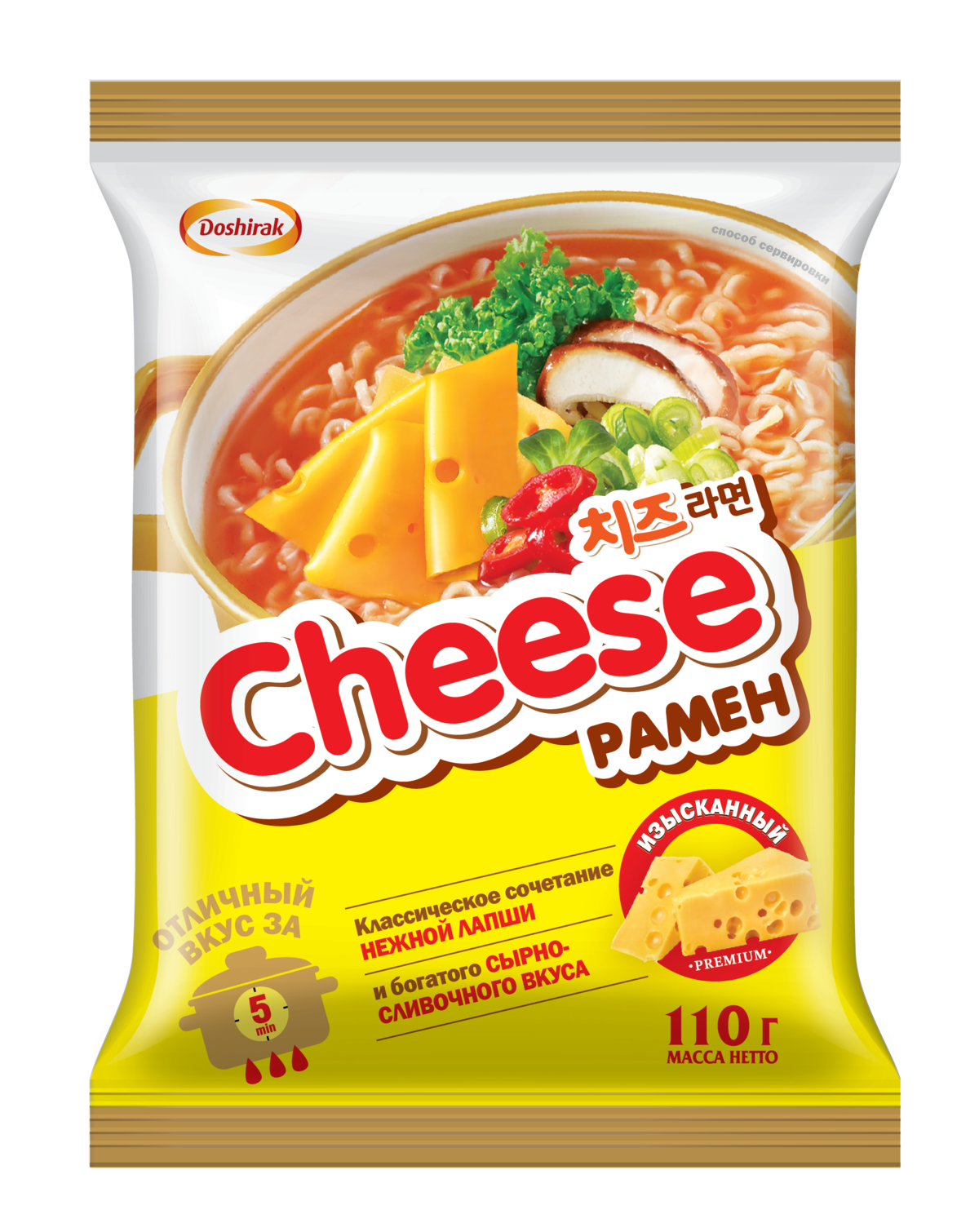 Лапша быстрого приготовления «Cheese Ramen» - традиционная корейская лапша быстрого приготовления, обеспечивающая быстрый и простой способ насладиться вкусом любимой лапши. «Cheese Ramen» - это не острое блюдо и изысканный вкус сыра позволит насладиться всем, вне зависимости от возраста. Благодаря сырной приправе в составе «Cheese Ramen» бульон имеет мягкий и насыщенный вкус. Лапша быстрого приготовления «Cheese Ramen» - это лапша, которую надо варить, но при этом лапша становится мягкой, но не разваривается. Во время варки бульон становится наваристым и аппетитным, что придает особый вкус блюду.